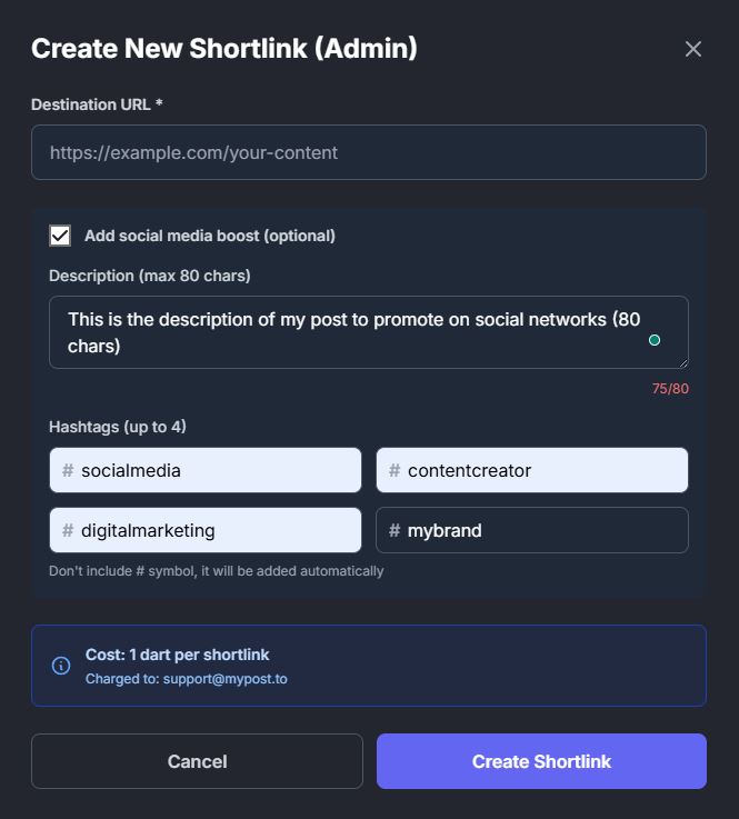 The cost is 1 Dart per shortlink, lifetime statistics, no hidden fees, and no monthly fee!